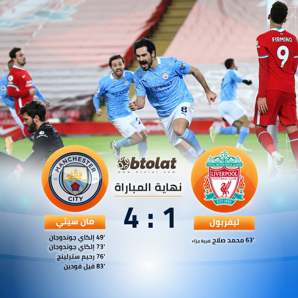موقع بطولات نهاية المباراة مانشستر سيتي يفترس ليفربول على ملعب انفيلد ويفوز بنتيجة 4 1 ليواصل الريدز نتائجه السلبية في البريميرليج جوارديولا يحقق أول فوز له في الأنفيلد مع مانشستر سيتي